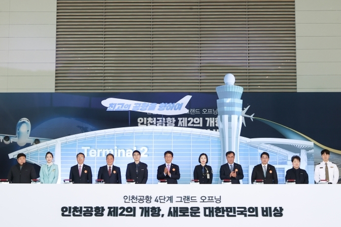 국토교통부와 인천국제공항공사는 29일 ‘인천공항 4단계 그랜드 오프닝 행사’를 개최했다. 오프닝 행사는 인천공항 제2여객터미널 확장 구역에서 개최되었으며, 박상우 국토교통부 장관, 유정복 인천광역시장, 이학재 인천국제공항공사 사장, 맹성규 국토교통위원장, 배준영 국민의힘 원내수석부대표, 공항 관계자 등 800여 명이 참석했다.