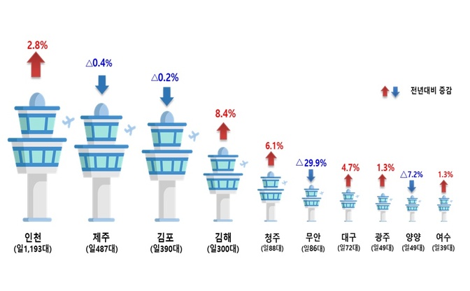 주요 공항별로는 인천공항이 일평균 1193대(전년대비 2.8%↑)로 가장 많은 교통량을 기록했으며, 제주공항 487대(0.4%↓), 김포공항 390대(0.2%↓) 순으로 나타났다.