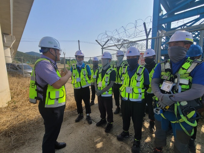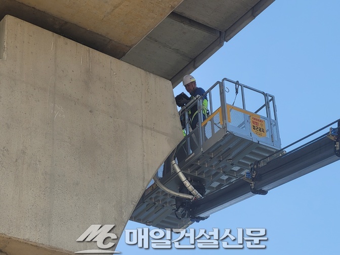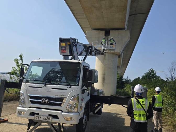 황룡강 초입의 관리용 도로(폭 5m)를 지나며 지상부터 5m 이상 올라가 고소작업대에서 교량 거더의 손상 상태를 꼼꼼히 육안으로 점검하는 2명의 작업자가 보였다. 용역을 감독하고 있는 국가철도공단 담당 관리관과 신호수가 크레인을 예의 주시하며 작업자의 안전을 유심히 지켜 보았다. 지상에는 나머지 20명의 진단 기술인들이 분주히 자기의 자리에서 현장 진단을 준비하고 있었다. 기술인 전원이 무더위 속 안전모와 안전조끼 등 안전보호장구를 착용하고 있었다.